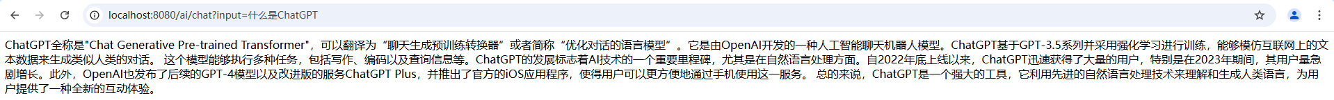 然后访问:http://localhost:8080/ai/chat?input=什么是ChatGPT