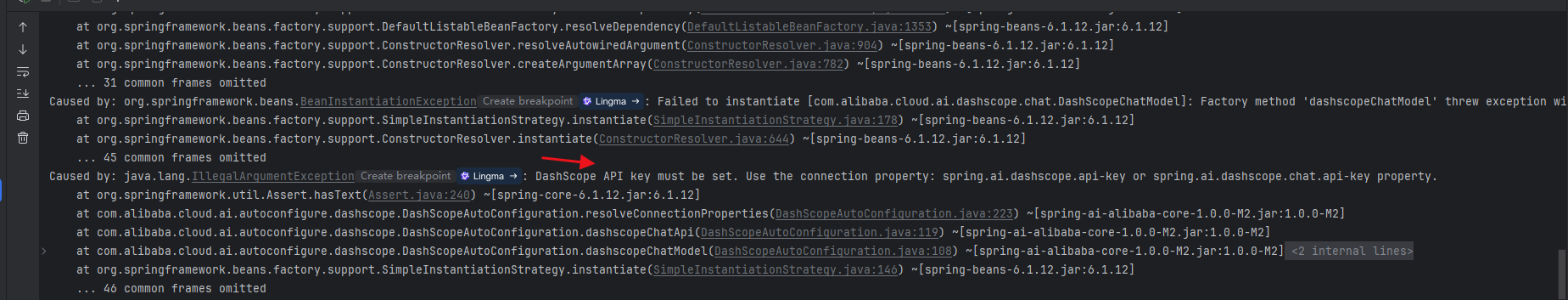 发现报错了,看日志是调用大模型需要一个 API KEY,我们找下官方文档:https://help.aliyun.com/zh/model-studio/getting-started/first-api-call-to-qwen?spm=a2c4g.11186623.0.0.5a06b0a8xgAh77
